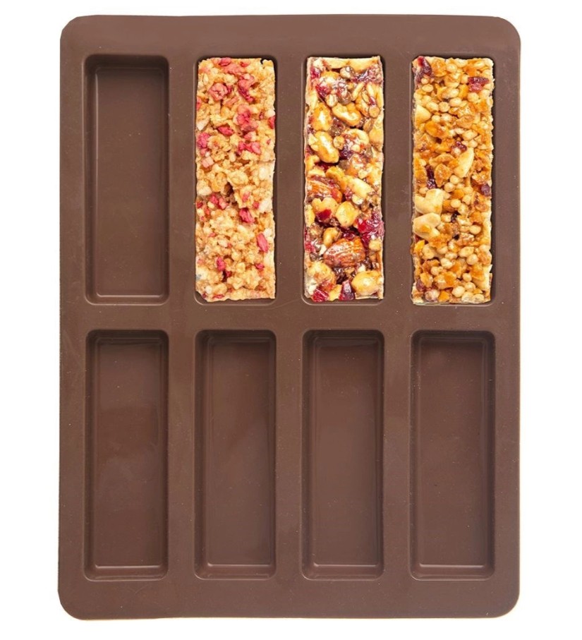 Forma silikonowa do batonów musli. Z jej pomocą przygotujemy 8 sztuk zdrowych batoników. Ciasto nie przywiera, idealnie się wyciąga. Odporna na temperaturę.