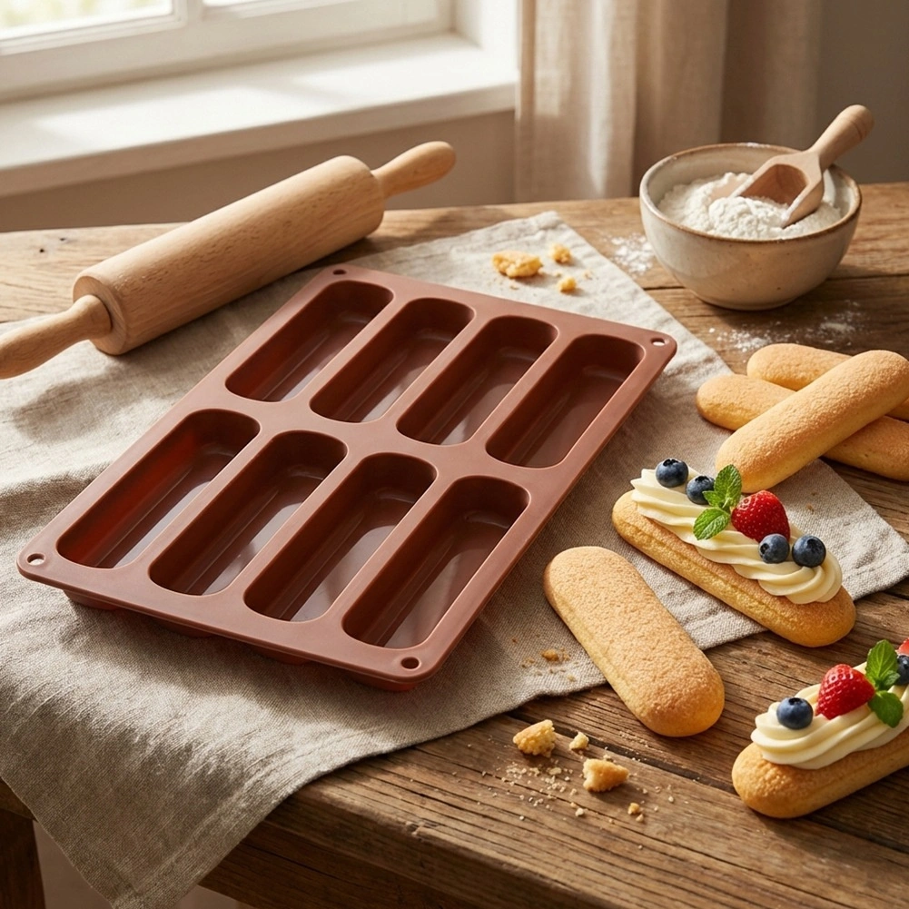 Forma silikonowa do pieczenia biszkoptów. Jest lekka, elastyczna i zajmuje mało miejsca. Materiał odporny na zmiany temperatury, bardzo dobrze przewodzi ciepło.