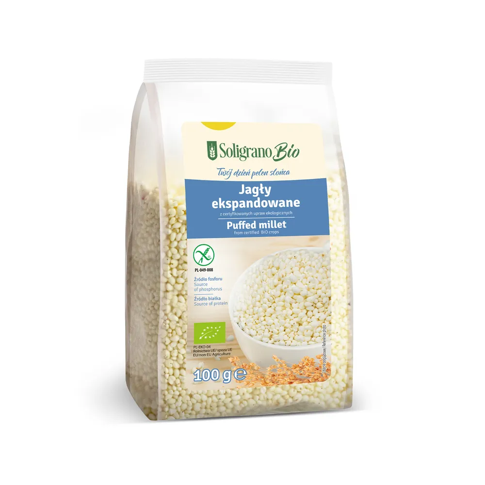 Jagła Soligrano BIO powstała z całych ziaren zbóż z certyfikowanych upraw ekologicznych, nie zawiera GMO, pestycydów ani sztucznych dodatków. Dzięki temu, że poddajemy ją działaniu jedynie odrobiny pary i temperatury, zachowują witaminy i składniki mineralne. Jagły, zwane również prosem, znane są z właściwości detoksykujących organizm. Białko zawarte w produkcie przyczynia się do wzrostu masy mięśniowej, a fosfor pomaga w utrzymaniu zdrowych kości. Jagły ekspandowane Soligrano BIO są produktem bezglutenowym i doskonale nadają się dla osób z nietolerancją glutenu.