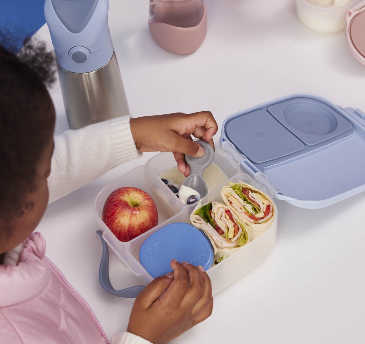 Mini lunchbox b.box dla dzieci ma dwie szczelne przegródki w tym jedną flex przeznaczoną na całe owoce. W przegrody te można włożyć także takie przekąski jak jogurt, humus, gęsty przecier, dip, owoce i warzywa. Obok znajduje się przegroda bez uszczelki z przesuwanym i wyjmowanym elementem dzielącym ułatwiającym dopasowanie do potrzeb. Lunchbox b.box ma kształt poręcznej walizeczki w wygodnym uchwytem i prostym w obsłudze zatrzaskiem.