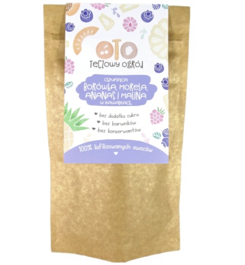 Skład: 100% liofilizowane owoce w kawałkach: borówka liofilizowana 25%, morela liofilizowana 25%, malina liofilizowana 25%, ananas liofilizowany 25%