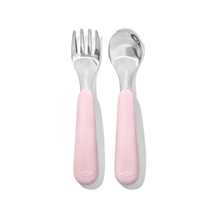 Zestaw sztućców z kolekcji OXO TOT składający się z łyżki oraz widelca oraz etui dostępny w pastelowym kolorze. To rozwiązanie w sam raz dla malucha, który rozpoczyna naukę samodzielnego jedzenia.