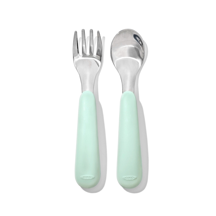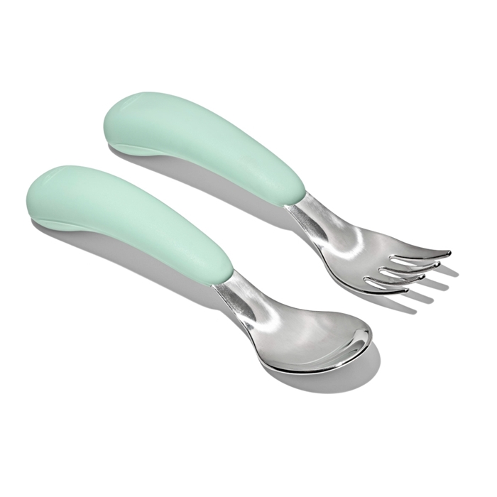 Zestaw sztućców z kolekcji OXO TOT składający się z łyżki oraz widelca oraz etui dostępny w pastelowym kolorze. To rozwiązanie w sam raz dla malucha, który rozpoczyna naukę samodzielnego jedzenia.
