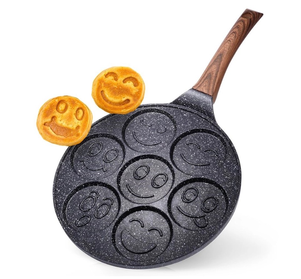 - NIEZAWODNA – Patelnia zapewnia szybkie i jednolite smażenie, co pozwala oszczędzać energię. Świetnie sprawdzi się do smażenia oraz duszenia. Pozwala uzyskać perfekcyjny kształt potraw. Przygotujemy na niej jajka sadzone, placuszki, a także ulubione naleśniki typu pancakes, nadając im kształt okrągłych buziek z uśmiechami i oczami.