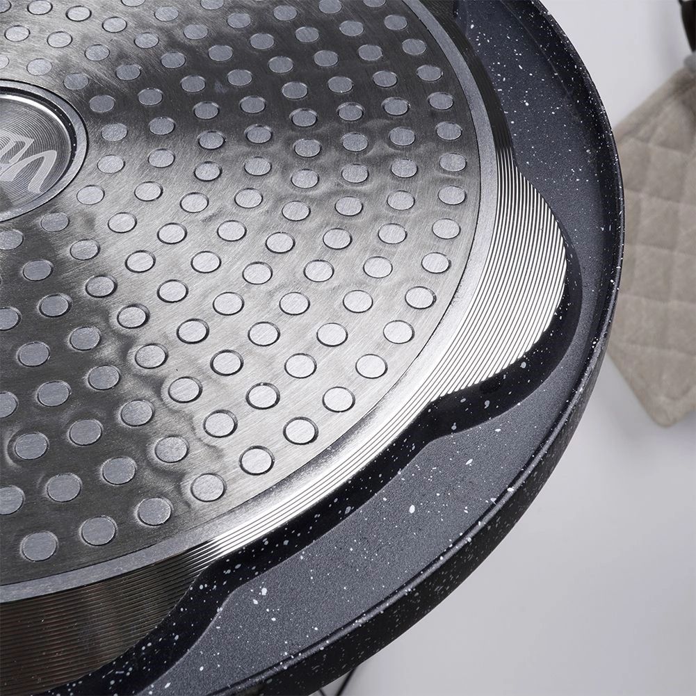 - NIEPRZYWIERAJĄCA – Patelnia wykonana z aluminium z nieprzywierającą powłoką granitową w czarnym kolorze. Powierzchnia nieprzywierająca umożliwia przygotowywanie zdrowych i smacznych posiłków z minimalną ilością tłuszczu. Wyposażona w uchwyt wykonany z najwyższej jakości, wytrzymałego tworzywa imitującego drewno.