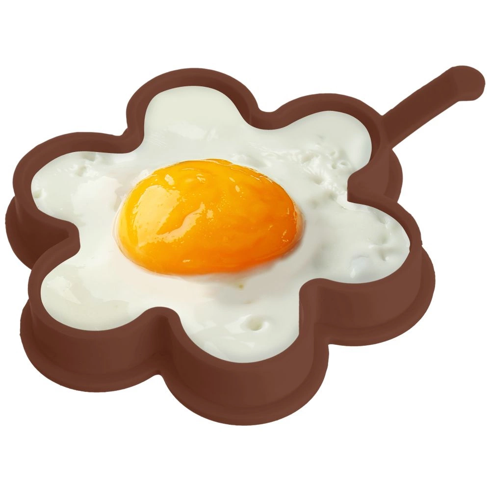 Brązowa forma silikonowa do sadzonych jajek lub placków w kształcie kwiatka. Forma wyposażona w uchwyt dla lepszej obsługi. Jajko ani ciasto nie przywiera, idealnie się wyciąga.