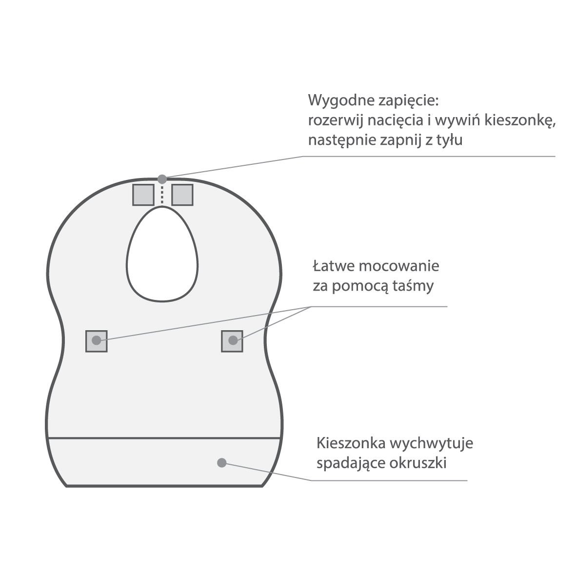 Rozerwij perforację, wywiń kieszonkę, zapnij z tyłu i Twój maluszek jest zabezpieczony przed zabrudzeniem oraz gotowy do jedzenia.