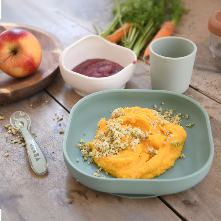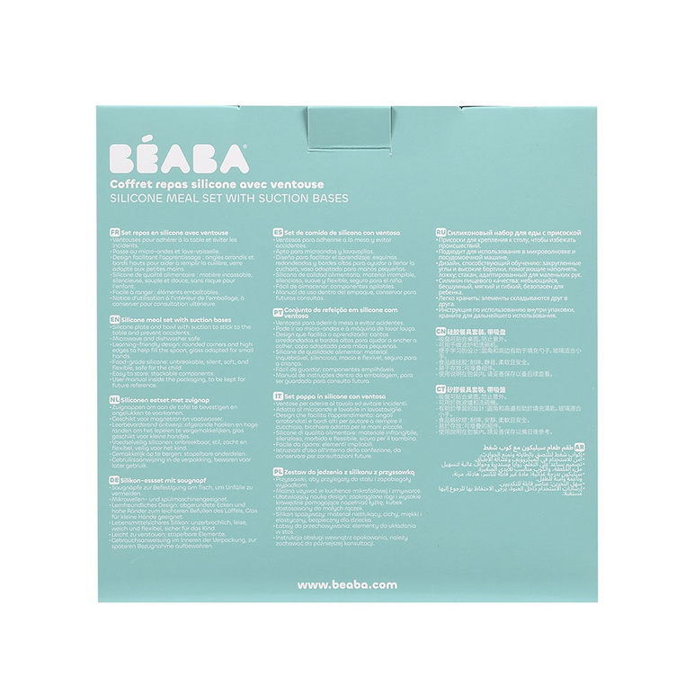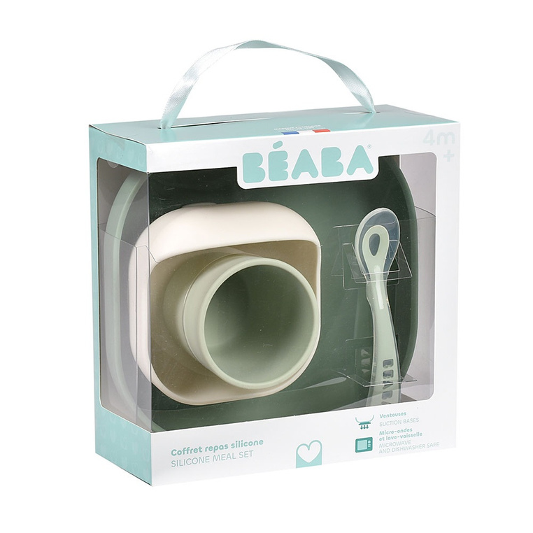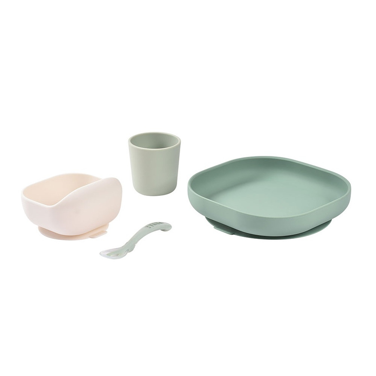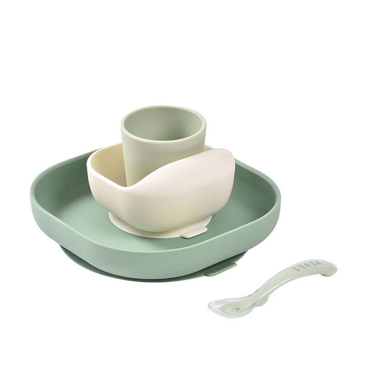 Komplet naczyń z silikonu francuskiej marki BEABA składa się z talerzyka, miseczki, kubka i łyżeczki treningowej. Talerzyk i miseczka posiadają kwadratowy kształt z wysokimi, zaokrąglonymi po bokach brzegami, co wspiera dziecko w nauce samodzielnego jedzenia.