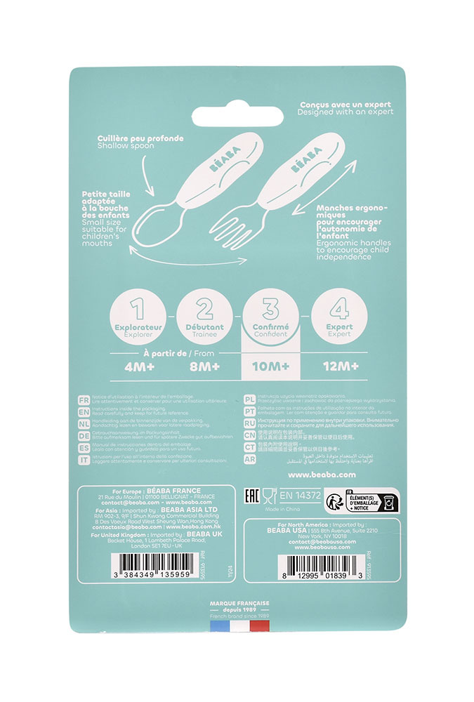 Zestaw innowacyjnych ergonomicznych pierwszych sztućców francuskiej marki BEABA zaprojektowany pod okiem specjalistów od żywienia niemowląt, aby wspierać rozwój i samodzielność maluszków. Łyżeczka i widelec wykonane zostały ze stali nierdzewnej, a ich uchwyt z elastycznego silikonu